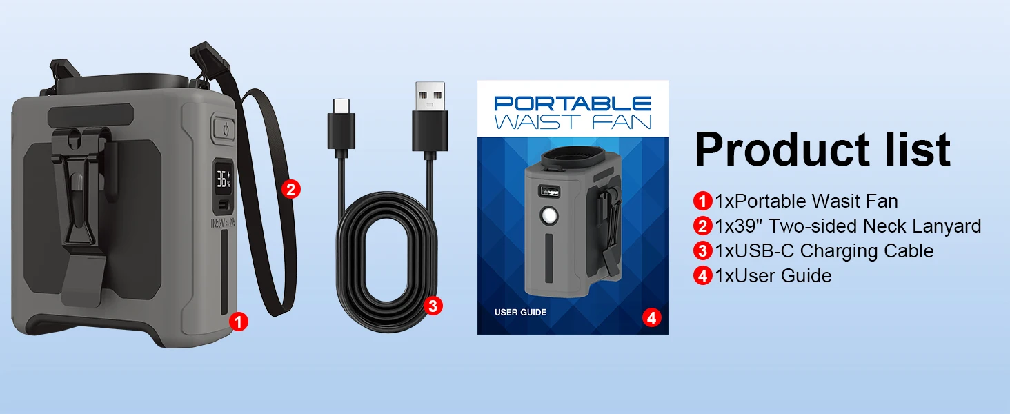 1.Integrated Design: Combining a wearable personal fan, power bank, LED/SOS flashlight, and belt personal cooling fan into one device, it's perfect for outdoor work, emergencies, travel, and adventure.